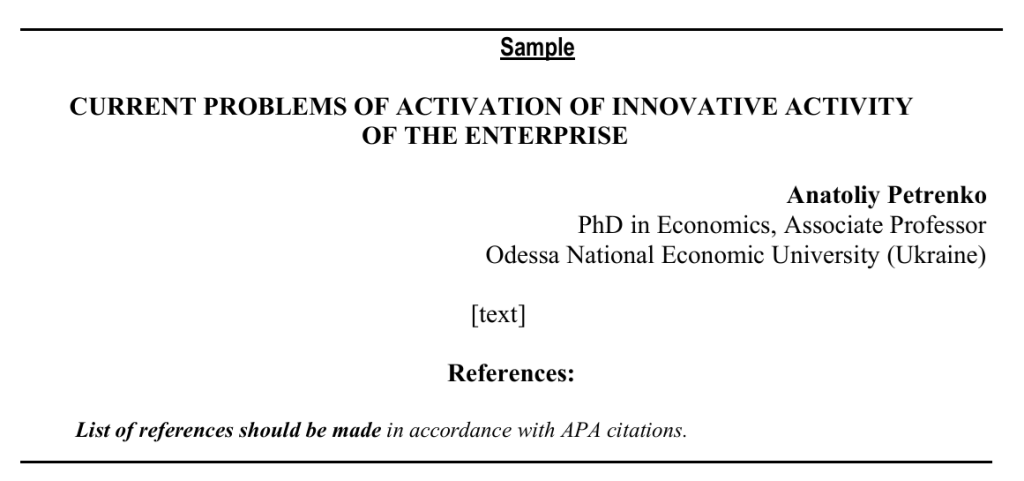 - Document formatting: title in all caps; next line – the name of the author(s); next line – scientific