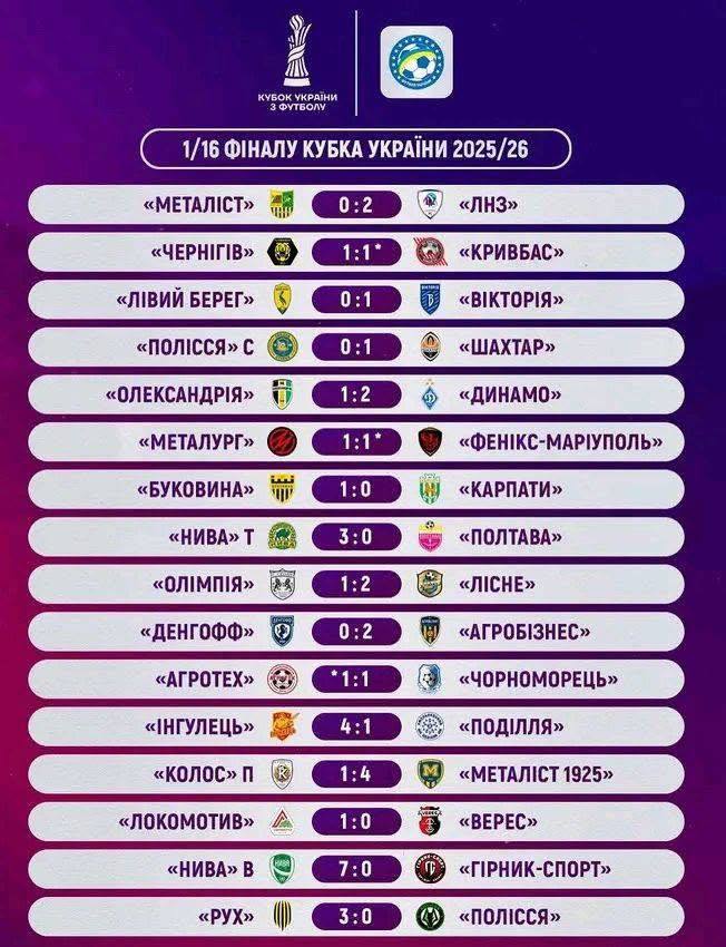 24 вересня завершилися матчі 1/16 фіналу Кубка України сезону 2025/2026. На цій стадії в боротьбу вступили обидва представники Львова — «Карпати» та «Рух».