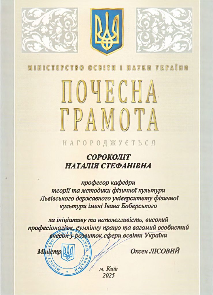 Колектив Львівського державного університету фізичної культури імені Івана Боберського щиро вітає Сороколіт Наталію Стефанівну, доктора наук з фізичного виховання і спорту, професора кафедри теорії та методики фізичної культури, з нагородженням Почесною грамотою Міністерства освіти і науки України!