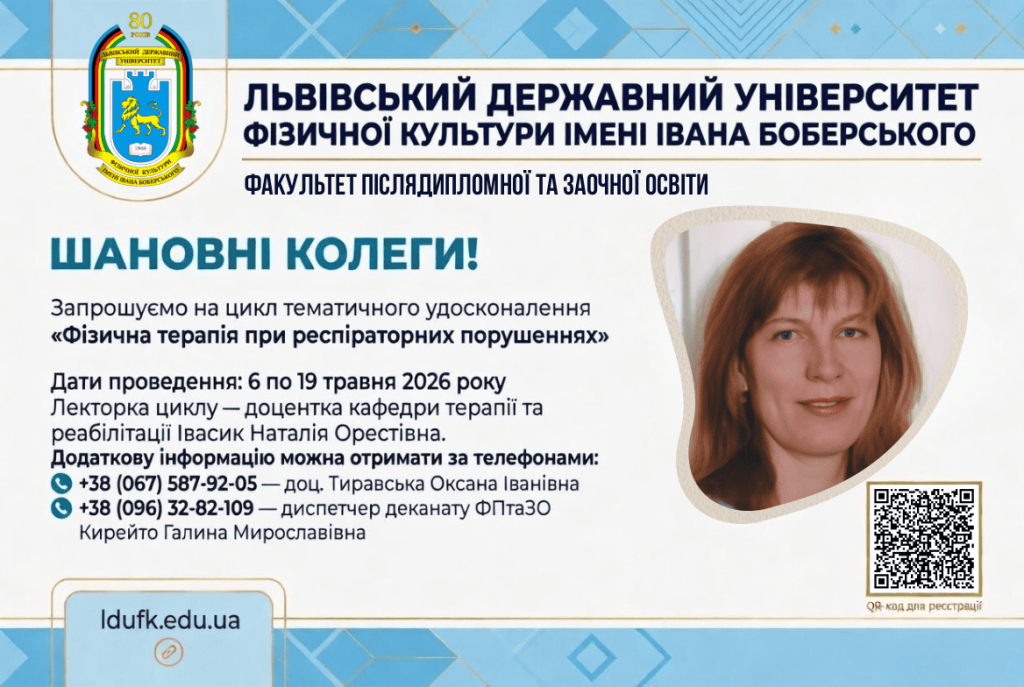 6 травня у Львівському державному університеті фізичної культури імені Івана Боберського на факультеті післядипломної та заочної освіти розпочнеться цикл тематичного удосконалення «Фізична терапія при респіраторних порушеннях».