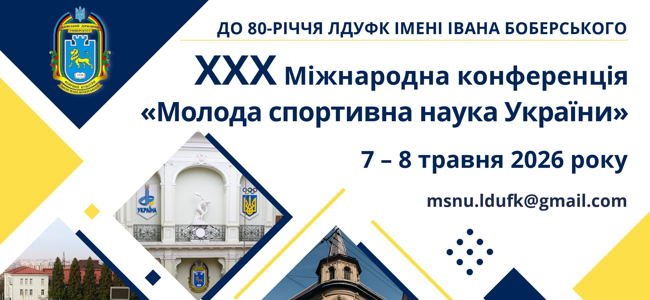 МІНІСТЕРСТВО Молоді та спорту УКРАЇНИ ЛЬВІВСЬКИЙ ДЕРЖАВНИЙ УНІВЕРСИТЕТ ФІЗИЧНОЇ КУЛЬТУРИ імені Івана Боберського 07 – 08 травня 2026 року XXХ Наукова конференція «Молода спортивна наука України» до 80-річчя ЛДУФК імені Івана Боберського ...