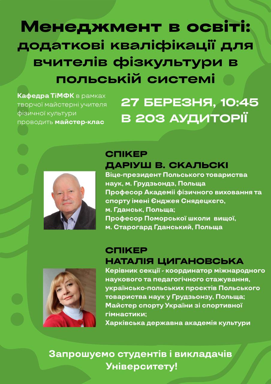 27 березня в головному корпусі Львівський державний університет фізичної культури імені Івана Боберського кафедра теорії і методики фізичної культури в рамках творчої майстерні вчителя фізичної культури проводить майстер-клас.